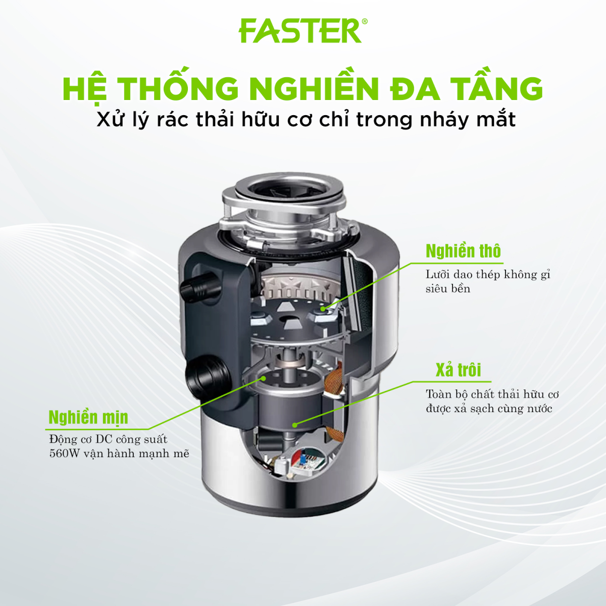 Thiết bị này hoạt động dựa trên nguyên lý xoay tốc độ cao của motor kết hợp với lưỡi nghiền bằng thép không gỉ, giúp xử lý rác nhanh chóng, không gây tắc nghẽn và hạn chế tối đa mùi hôi trong bếp.